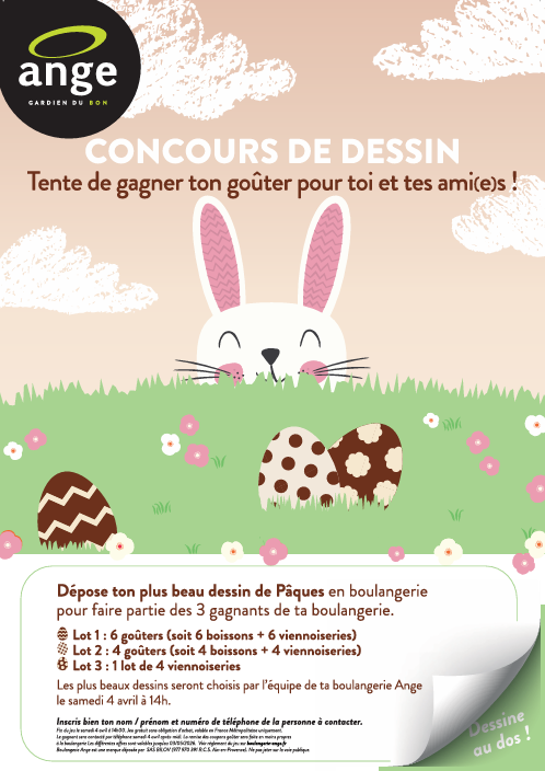 Les petits gourmands sont également invités à participer à notre concours de dessin spécial Pâques. Comment participer ? Il suffit de déposer leur plus beau dessin en boulangerie avant le samedi 4 avril. Les 3 gagnants pourront gagner leur goûter à partager avec leurs ami(e)s.